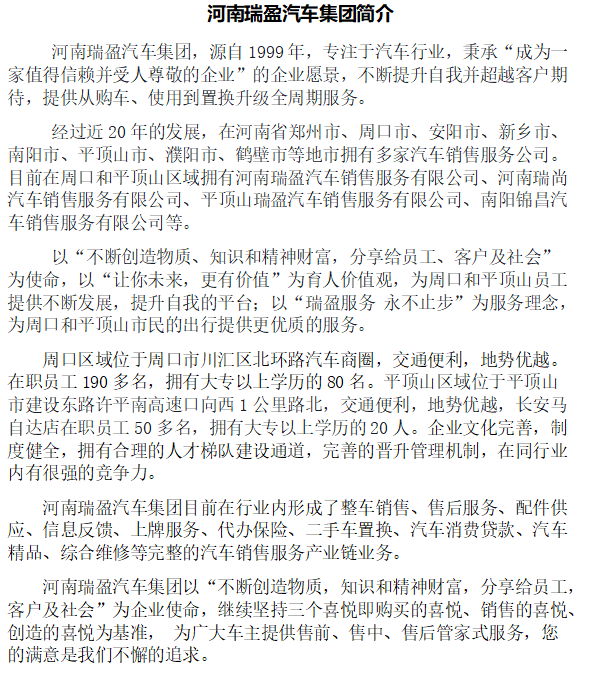 招聘单位:河南瑞盈汽车销售服务有限公司